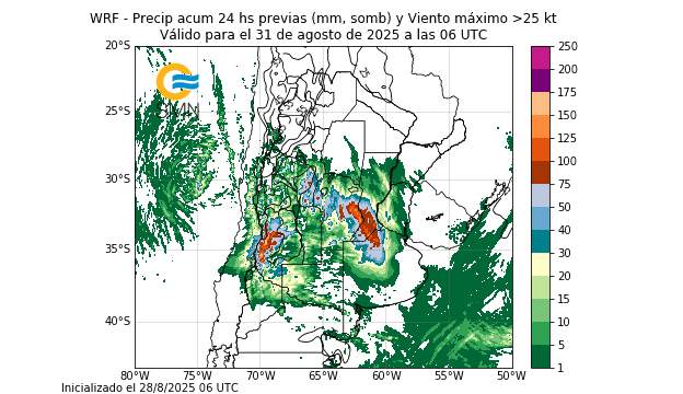 Durante todo el período se esperan valores de precipitación acumulada que oscilarán entre los 20 y los 120 milímetros, aunque en algunos sectores podrán registrarse lluvias más abundantes, entre 120 y 150 milímetros, e incluso superiores. A la fecha existe incertidumbre en torno a la localización exacta de los acumulados más importantes, pero la mayoría de los modelos de pronóstico numérico coinciden en que podrían concentrarse sobre Mendoza, San Luis, el sur de La Rioja, el centro y sur de Córdoba, el norte de La Pampa, el sur de Santa Fe y el norte y oeste de Buenos Aires.
